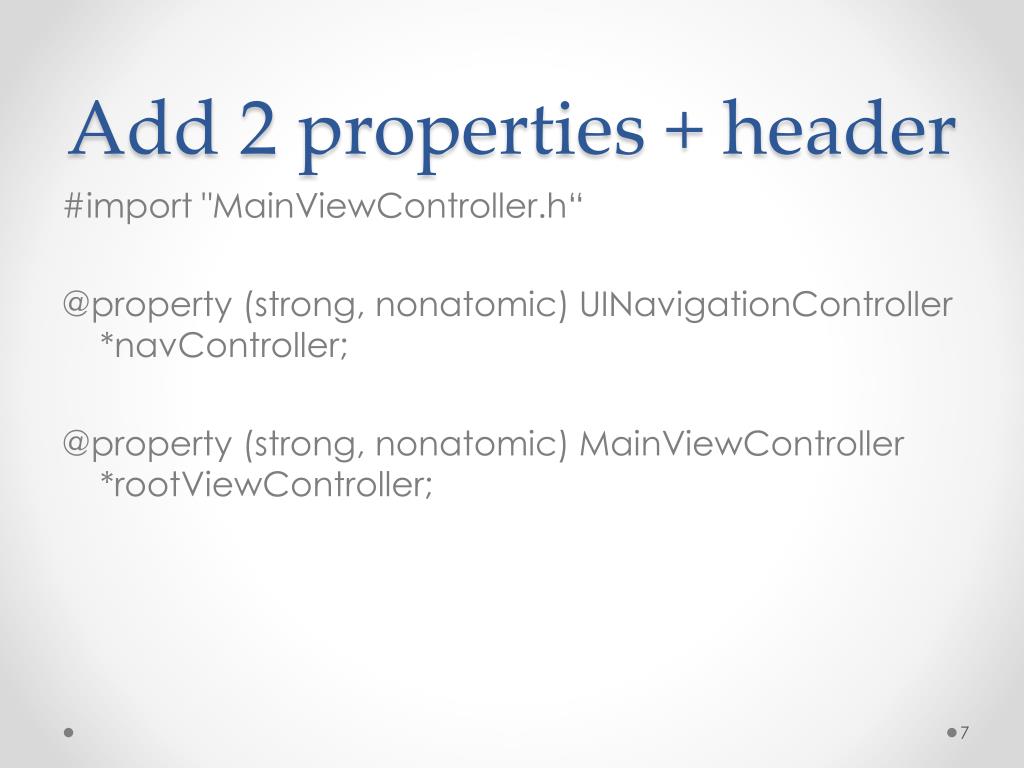 Add 2 properties + header #import "MainViewController.h“ @property (strong, nonatomic) UINavigationController *navController; @property (strong, nonatomic) MainViewController *rootViewController;