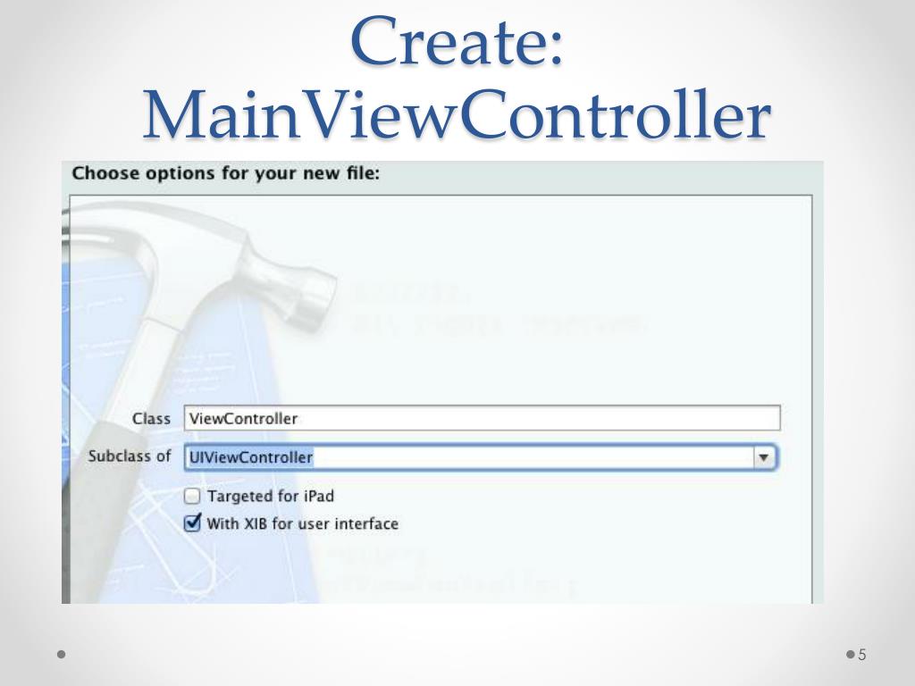 Add a new Class • Select the Objective-C class template, click Next • Name the class MainViewController. • Make sure that the class is a subclass of UIViewController and also create a XIB file for the controller’s view as shown:
