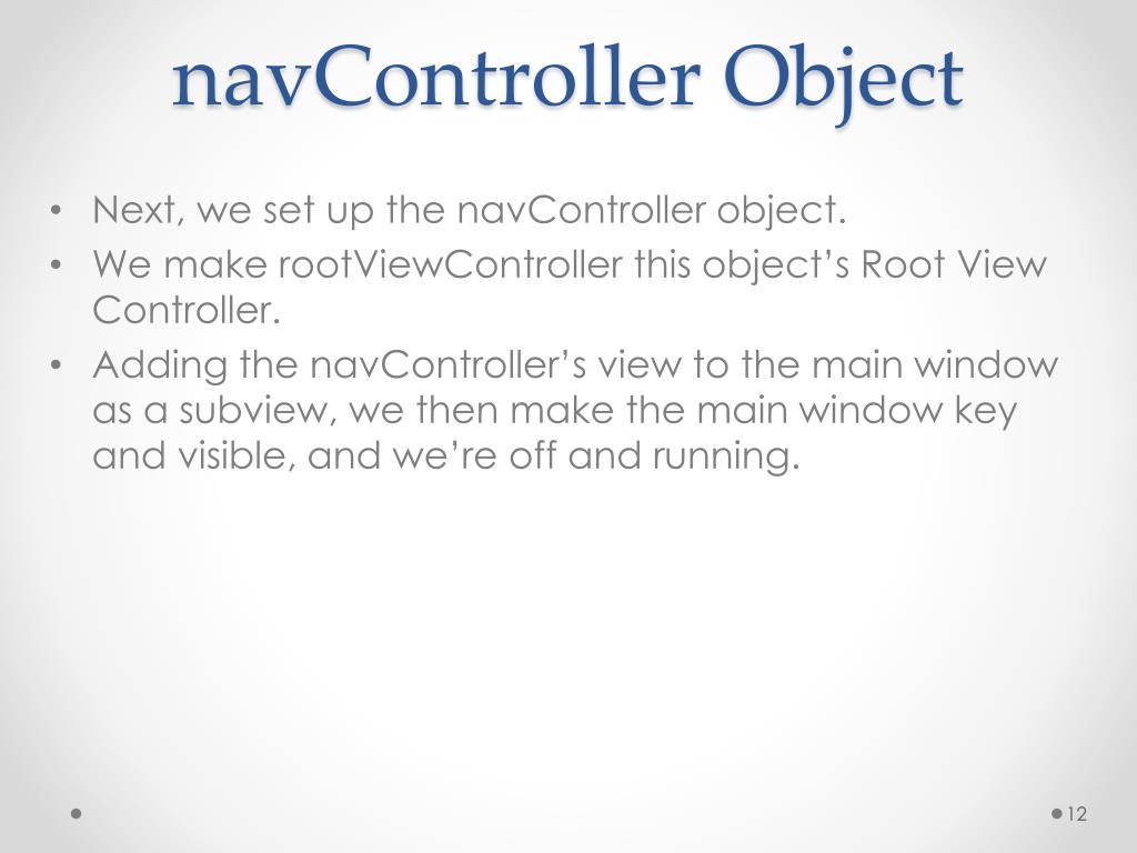 navController Object • Next, we set up the navController object. • We make rootViewController this object’s Root View Controller. • Adding the navController’s view to the main window as a subview, we then make the main window key and visible, and we’re off and running.