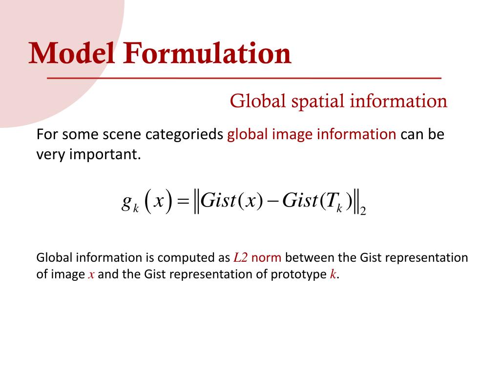 Model Formulation Global spatial information For some scene categorieds global image information can be very important. Global information is computed as L2 norm between the Gist representation of image x and the Gist representation of prototype k.