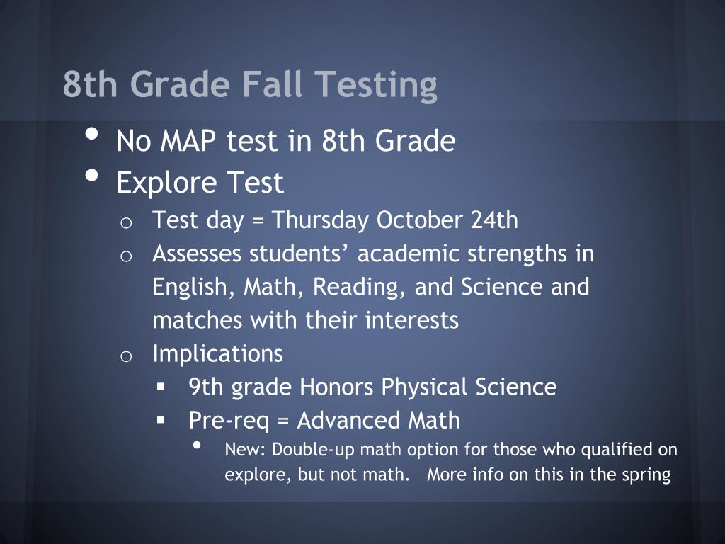8th Grade Fall Testing • No MAP test in 8th Grade • Explore Test • Test day = Thursday October 24th • Assesses students’ academic strengths in English, Math, Reading, and Science and matches with their interests • Implications • 9th grade Honors Physical Science • Pre-req = Advanced Math • New: Double-up math option for those who qualified on explore, but not math. More info on this in the spring