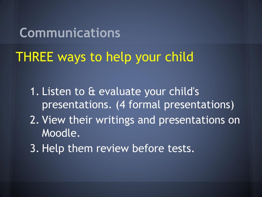 Communications THREE ways to help your child • Listen to & evaluate your child's presentations. (4 formal presentations) • View their writings and presentations on Moodle. • Help them review before tests.