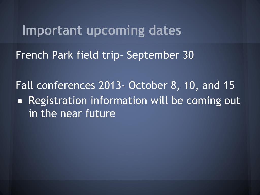 Important upcoming dates French Park field trip- September 30 Fall conferences 2013- October 8, 10, and 15 • Registration information will be coming out in the near future