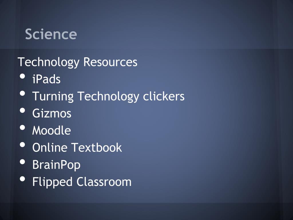 Science Technology Resources • iPads • Turning Technology clickers • Gizmos • Moodle • Online Textbook • BrainPop • Flipped Classroom