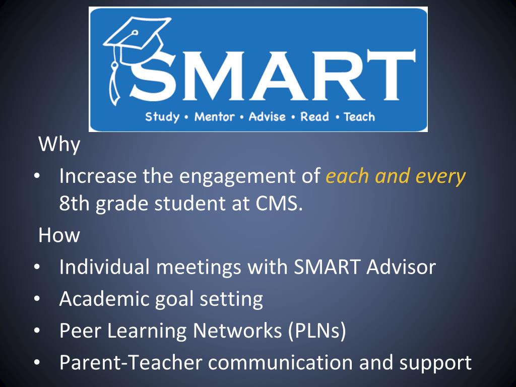 Why • Increase the engagement of each and every8th grade student at CMS. How • Individual meetings with SMART Advisor • Academic goal setting • Peer Learning Networks (PLNs) • Parent-Teacher communication and support