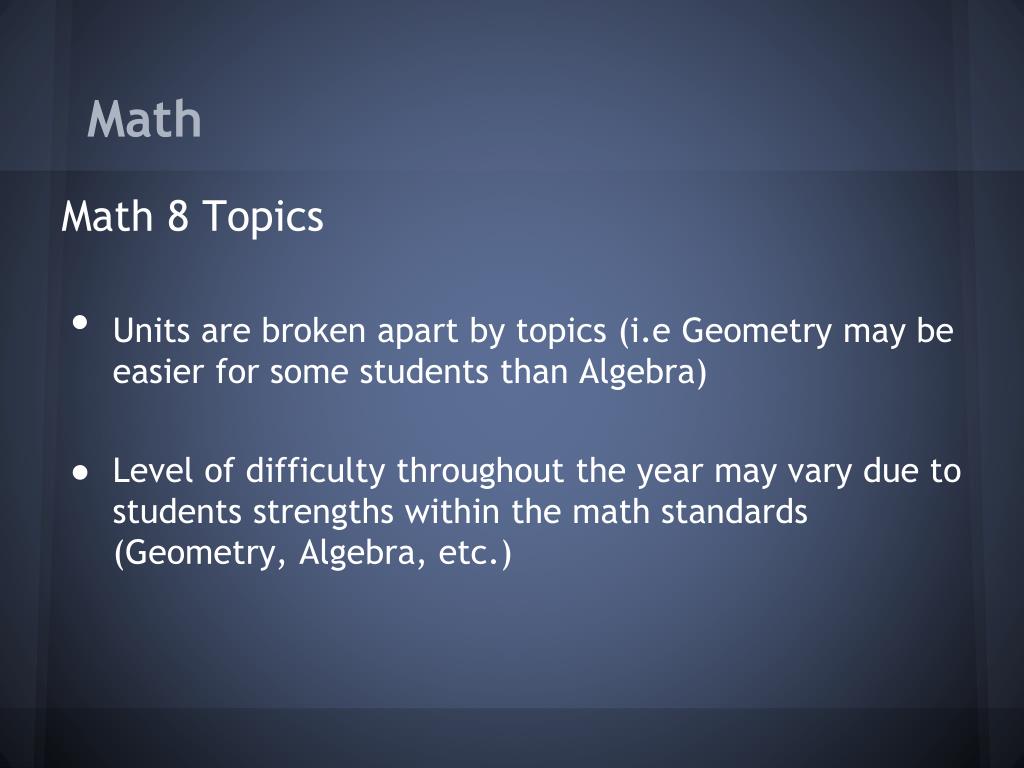 Math Math 8 Topics • Units are broken apart by topics (i.e Geometry may be easier for some students than Algebra) • Level of difficulty throughout the year may vary due to students strengths within the math standards (Geometry, Algebra, etc.)
