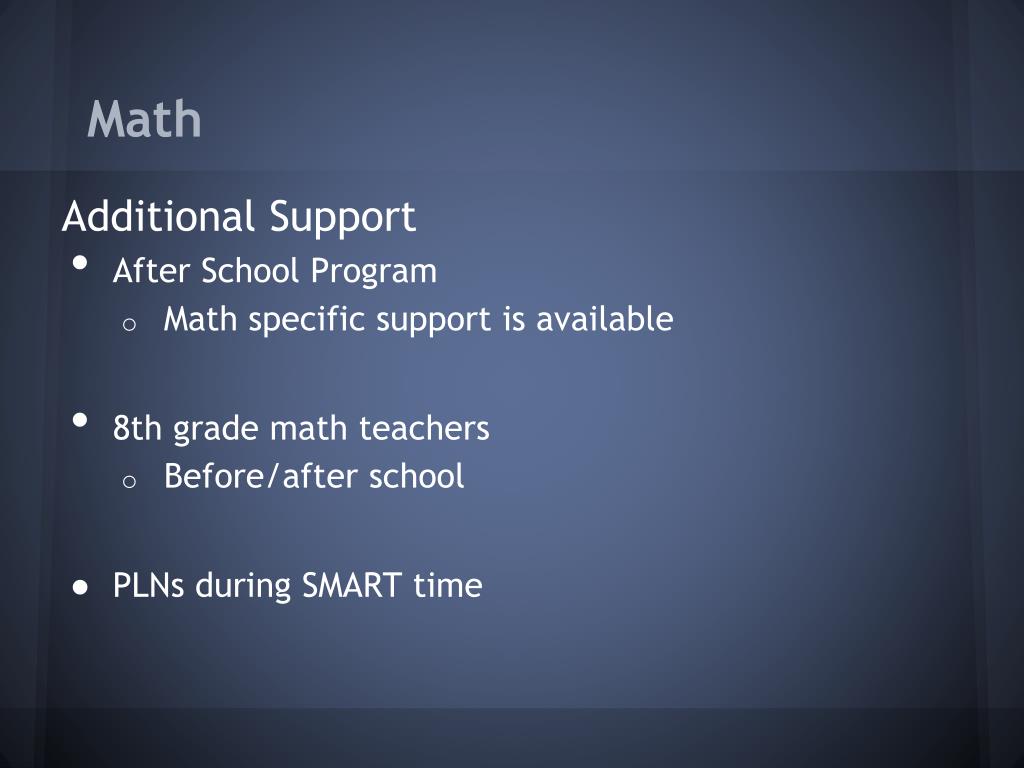 Math Additional Support • After School Program • Math specific support is available • 8th grade math teachers • Before/after school • PLNs during SMART time