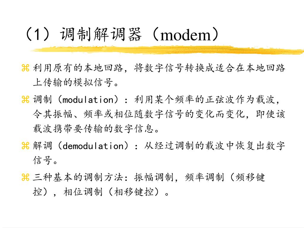 (1)调制解调器(modem) • 利用原有的本地回路,将数字信号转换成适合在本地回路上传输的模拟信号。 • 调制(modulation):利用某个频率的正弦波作为载波,令其振幅、频率或相位随数字信号的变化而变化,即使该载波携带要传输的数字信息。 • 解调(demodulation):从经过调制的载波中恢复出数字信号。 • 三种基本的调制方法:振幅调制,频率调制(频移键控),相位调制(相移键控)。
