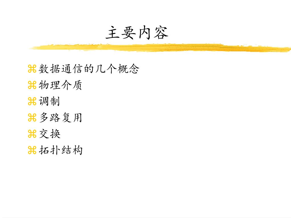 主要内容 • 数据通信的几个概念 • 物理介质 • 调制 • 多路复用 • 交换 • 拓扑结构