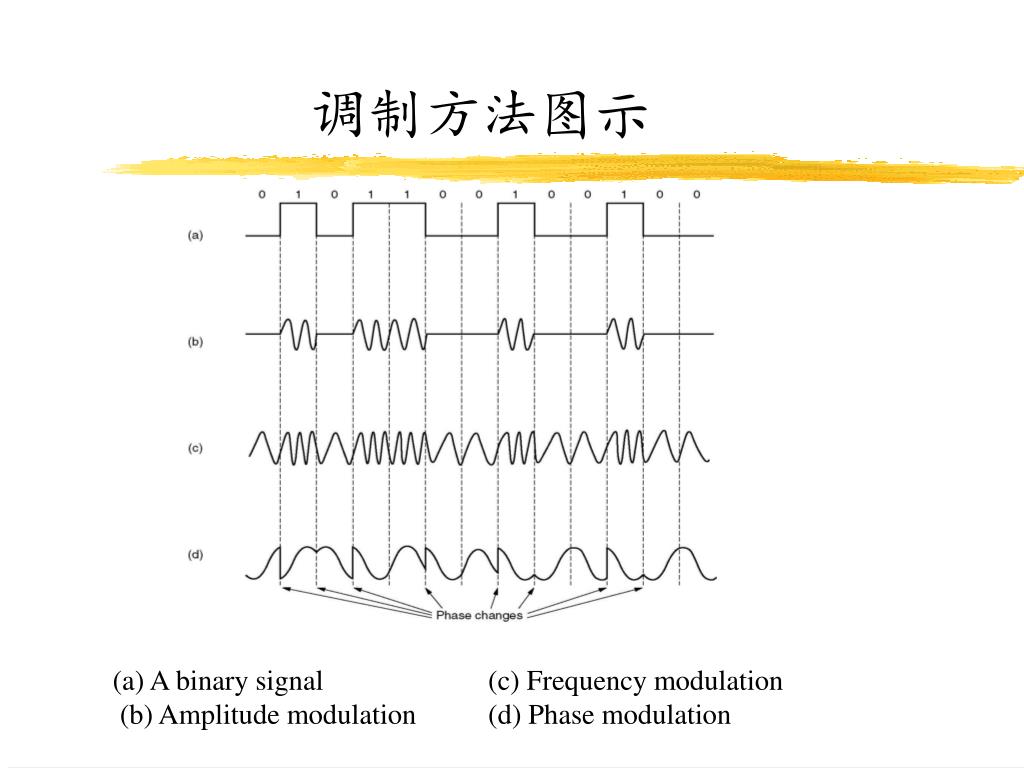 调制方法图示 (a) A binary signal (b) Amplitude modulation (c) Frequency modulation (d) Phase modulation