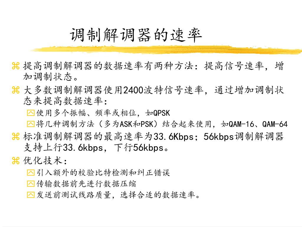 调制解调器的速率 • 提高调制解调器的数据速率有两种方法:提高信号速率,增加调制状态。 • 大多数调制解调器使用2400波特信号速率,通过增加调制状态来提高数据速率: • 使用多个振幅、频率或相位,如QPSK • 将几种调制方法(多为ASK和PSK)结合起来使用,如QAM-16、QAM-64 • 标准调制解调器的最高速率为33.6Kbps;56kbps调制解调器支持上行33.6kbps,下行56kbps。 • 优化技术: • 引入额外的校验比特检测和纠正错误 • 传输数据前先进行数据压缩 • 发送前测试线路质量,选择合适的数据速率。