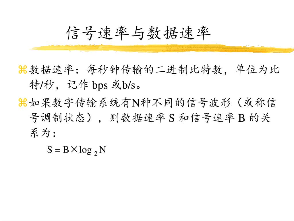 信号速率与数据速率 • 数据速率:每秒钟传输的二进制比特数,单位为比特/秒,记作 bps 或b/s。 • 如果数字传输系统有N种不同的信号波形(或称信号调制状态),则数据速率 S 和信号速率 B 的关系为: S = B×log 2 N