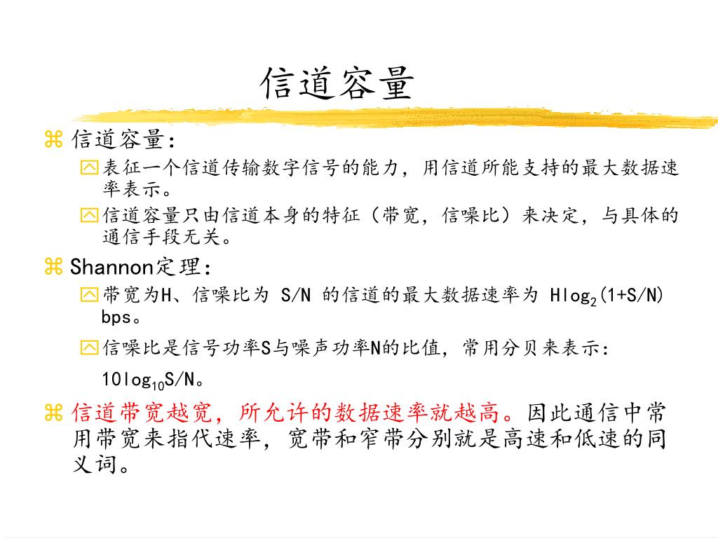 信道容量 • 信道容量: • 表征一个信道传输数字信号的能力,用信道所能支持的最大数据速率表示。 • 信道容量只由信道本身的特征(带宽,信噪比)来决定,与具体的通信手段无关。 • Shannon定理: • 带宽为H、信噪比为 S/N 的信道的最大数据速率为 Hlog2(1+S/N) bps。 • 信噪比是信号功率S与噪声功率N的比值,常用分贝来表示:10log10S/N。 • 信道带宽越宽,所允许的数据速率就越高。因此通信中常用带宽来指代速率,宽带和窄带分别就是高速和低速的同义词。