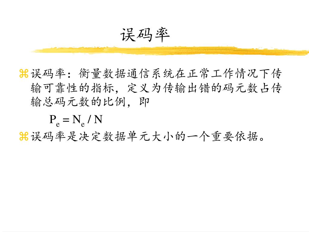 误码率 • 误码率:衡量数据通信系统在正常工作情况下传输可靠性的指标,定义为传输出错的码元数占传输总码元数的比例,即 Pe = Ne / N • 误码率是决定数据单元大小的一个重要依据。
