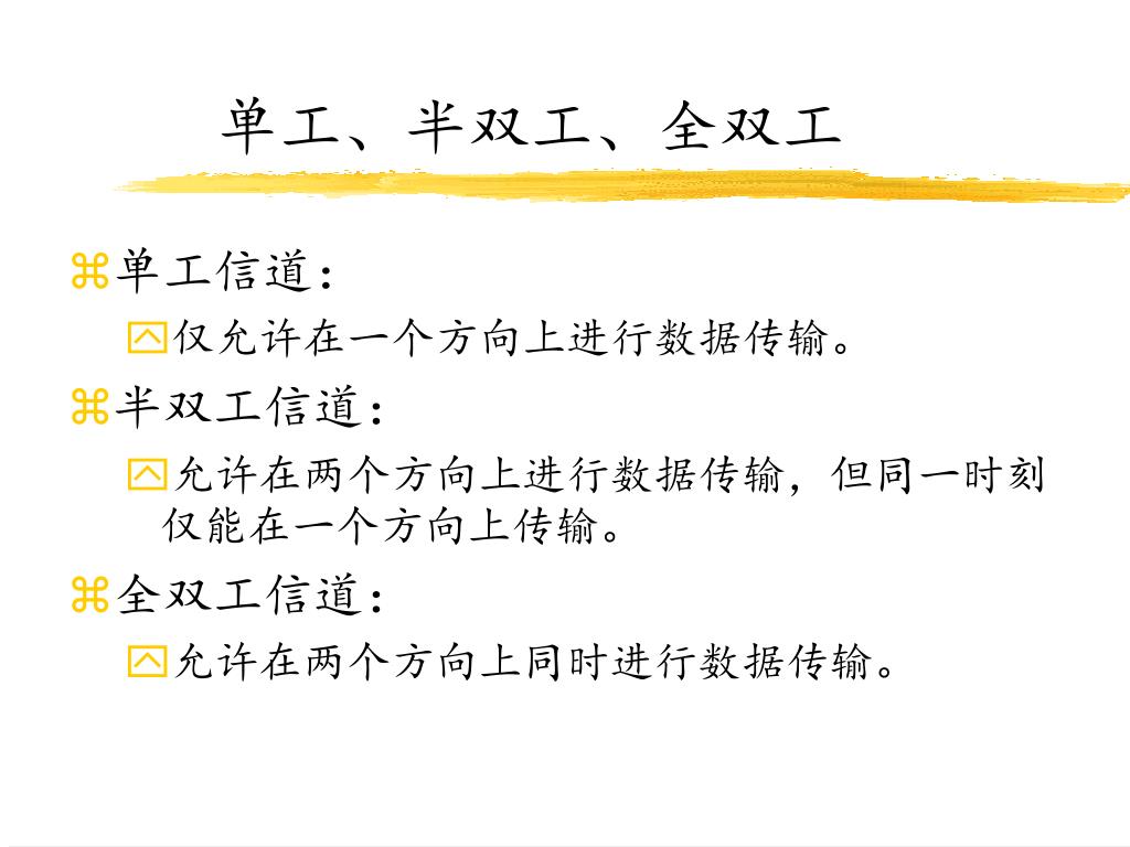 单工、半双工、全双工 • 单工信道: • 仅允许在一个方向上进行数据传输。 • 半双工信道: • 允许在两个方向上进行数据传输,但同一时刻仅能在一个方向上传输。 • 全双工信道: • 允许在两个方向上同时进行数据传输。