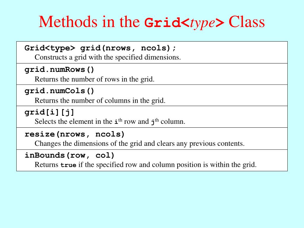 Grid<type> grid(nrows, ncols); resize(nrows, ncols) Constructs a grid with the specified dimensions. Changes the dimensions of the grid and clears any previous contents. grid.numRows() inBounds(row, col) Returns the number of rows in the grid. Returns true if the specified row and column position is within the grid. grid.numCols() grid[i][j] Returns the number of columns in the grid. Selects the element in the ith row and jth column. Methods in theGrid<type> Class
