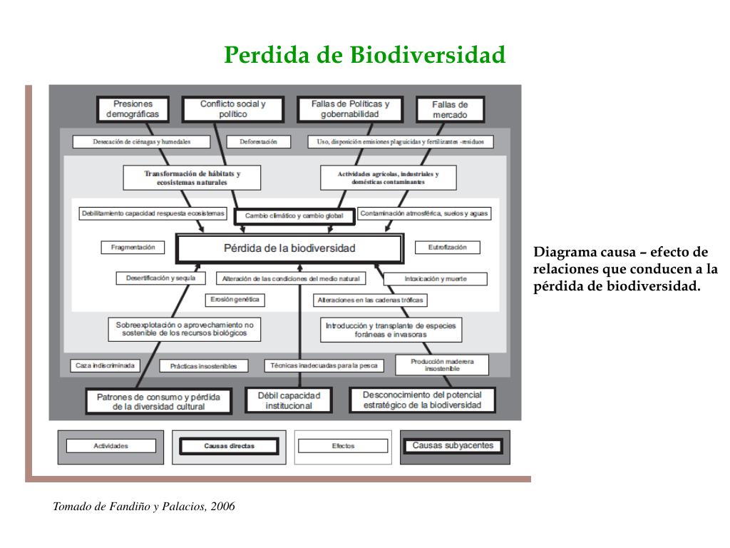 Perdida de Biodiversidad Diagrama causa – efecto de relaciones que conducen a la pérdida de biodiversidad. Tomado de Fandiño y Palacios, 2006