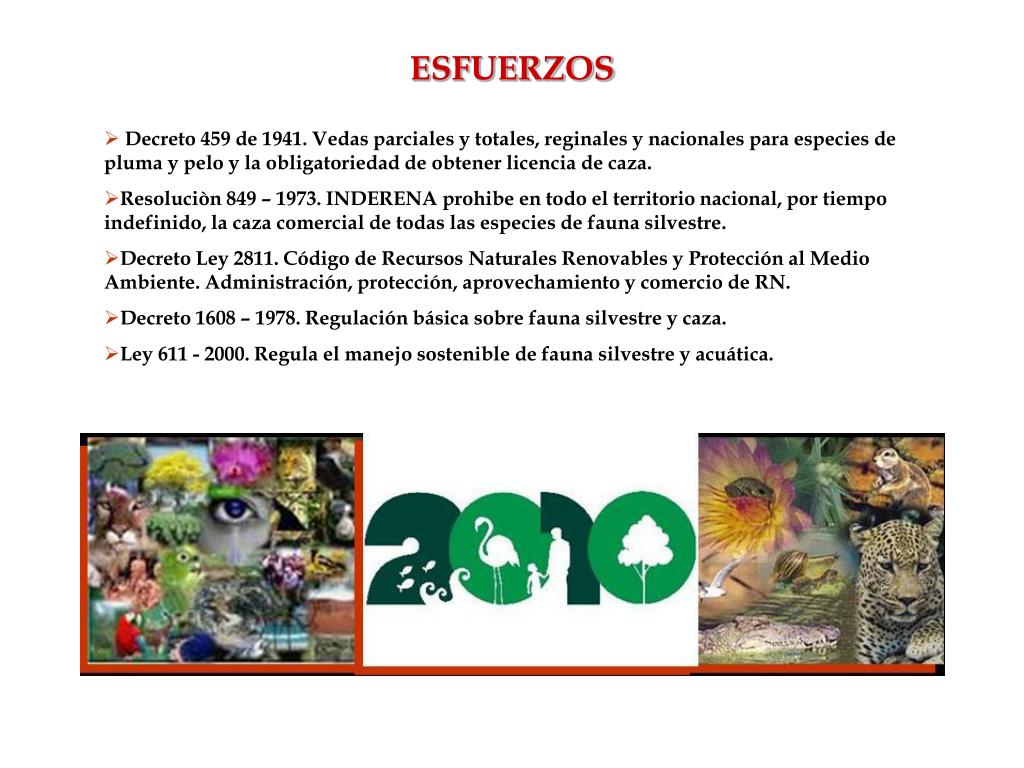 ESFUERZOS • Decreto 459 de 1941. Vedas parciales y totales, reginales y nacionales para especies de pluma y pelo y la obligatoriedad de obtener licencia de caza. • Resoluciòn 849 – 1973. INDERENA prohibe en todo el territorio nacional, por tiempo indefinido, la caza comercial de todas las especies de fauna silvestre. • Decreto Ley 2811. Código de Recursos Naturales Renovables y Protección al Medio Ambiente. Administración, protección, aprovechamiento y comercio de RN. • Decreto 1608 – 1978. Regulación básica sobre fauna silvestre y caza. • Ley 611 - 2000. Regula el manejo sostenible de fauna silvestre y acuática.