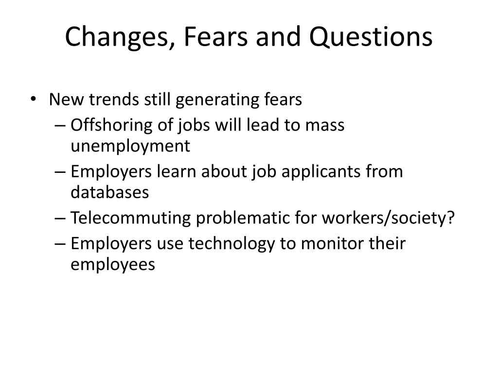 Changes, Fears and Questions • New trends still generating fears • Offshoring of jobs will lead to mass unemployment • Employers learn about job applicants from databases • Telecommuting problematic for workers/society? • Employers use technology to monitor their employees