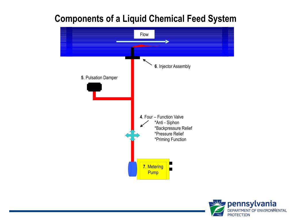 Flow 6 . Injector Assembly 5 . Pulsation Damper 4 . Four – Function Valve *Anti - Siphon *Backpressure Relief *Pressure Relief *Priming Function 7 . Metering Pump Components of a Liquid Chemical Feed System