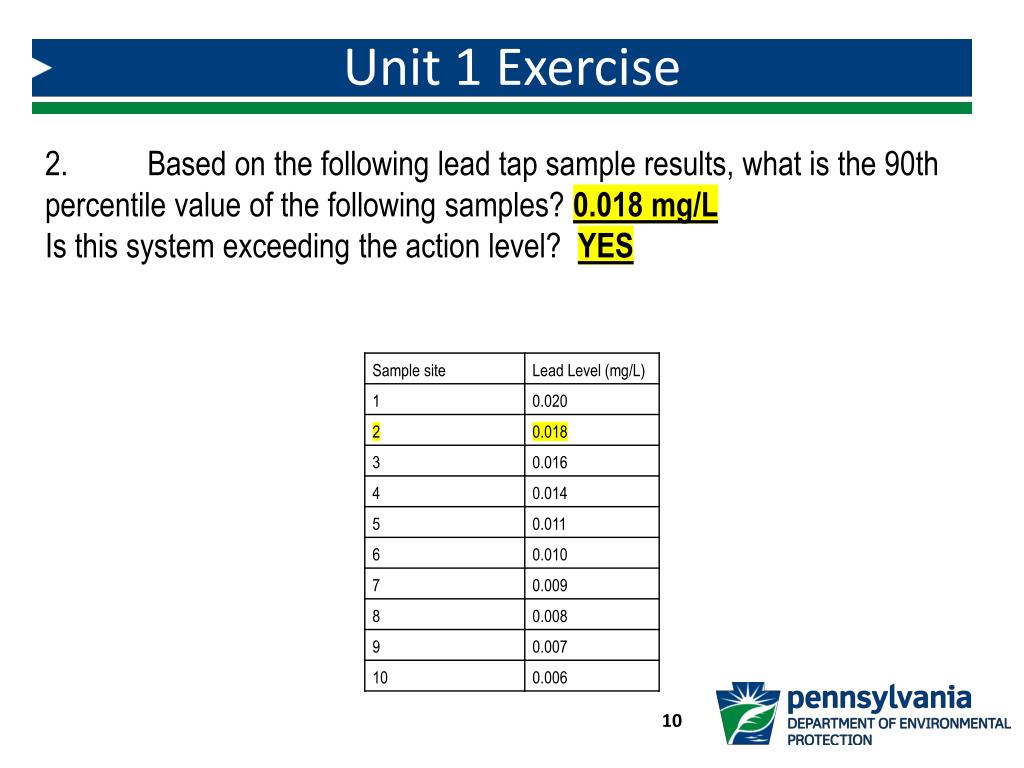 Unit 1 Exercise 2. Based on the following lead tap sample results, what is the 90th percentile value of the following samples? 0.018 mg/L Is this system exceeding the action level? YES