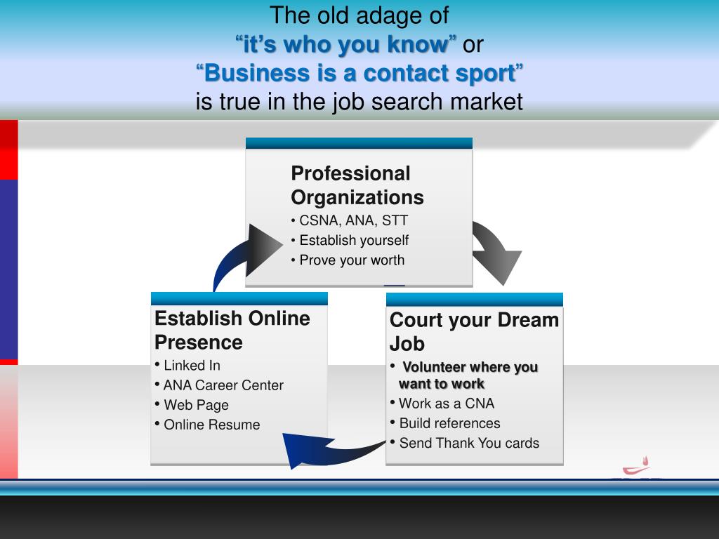 The old adage of “it’s who you know” or “Business is a contact sport” is true in the job search market • Professional Organizations • CSNA, ANA, STT • Establish yourself • Prove your worth • Establish Online Presence • Linked In • ANA Career Center • Web Page • Online Resume • Court your Dream Job • Volunteer where you want to work • Work as a CNA • Build references • Send Thank You cards . 33