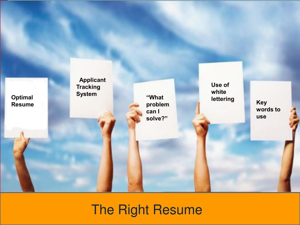 Applicant Tracking System Use of white lettering Optimal Resume “What problem can I solve?” Key words to use The Right Resume