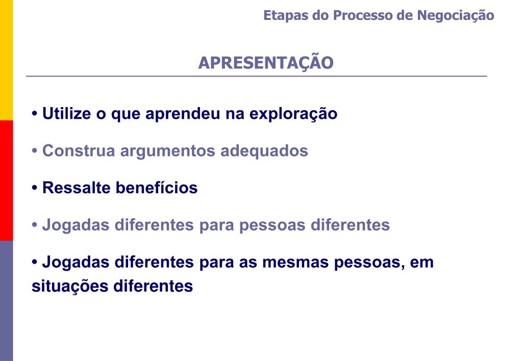 Etapas do Processo de Negociação APRESENTAÇÃO • Utilize o que aprendeu na exploração • Construa argumentos adequados • Ressalte benefícios • Jogadas diferentes para pessoas diferentes • Jogadas diferentes para as mesmas pessoas, em situações diferentes