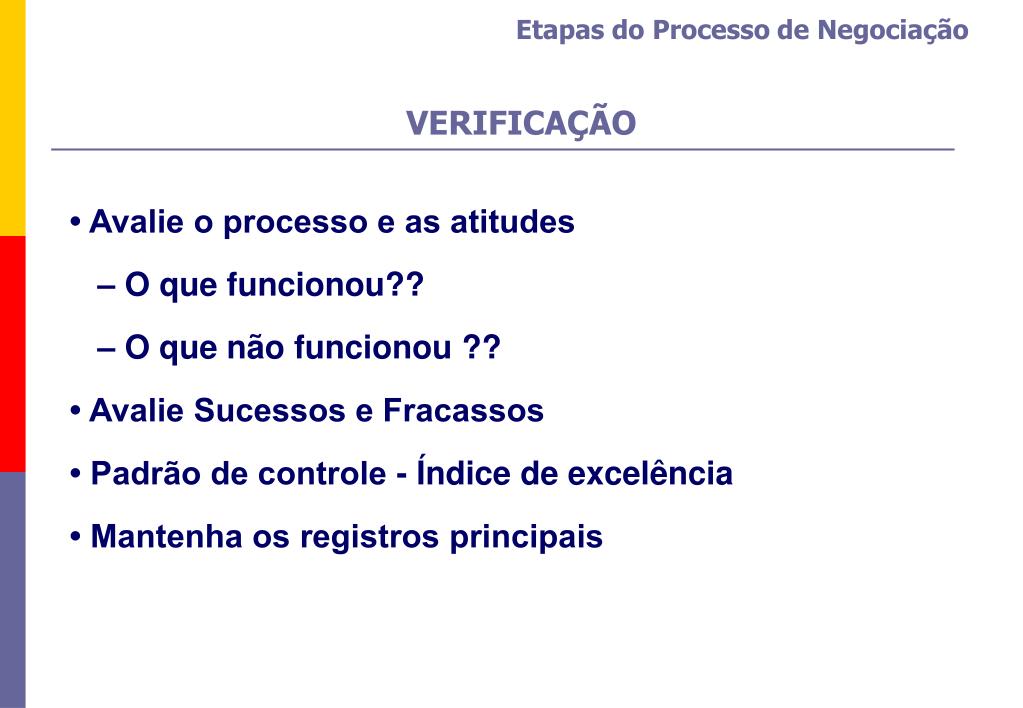 Etapas do Processo de Negociação VERIFICAÇÃO • Avalie o processo e as atitudes – O que funcionou?? – O que não funcionou ?? • Avalie Sucessos e Fracassos • Padrão de controle - Índice de excelência • Mantenha os registros principais