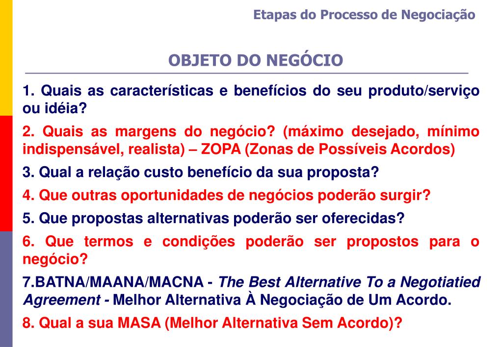 Etapas do Processo de Negociação OBJETO DO NEGÓCIO 1. Quais as características e benefícios do seu produto/serviço ou idéia? 2. Quais as margens do negócio? (máximo desejado, mínimo indispensável, realista) – ZOPA (Zonas de Possíveis Acordos) 3. Qual a relação custo benefício da sua proposta? 4. Que outras oportunidades de negócios poderão surgir? 5. Que propostas alternativas poderão ser oferecidas? 6. Que termos e condições poderão ser propostos para o negócio? 7.BATNA/MAANA/MACNA - The Best Alternative To a Negotiatied Agreement - Melhor Alternativa À Negociação de Um Acordo. 8. Qual a sua MASA (Melhor Alternativa Sem Acordo)?