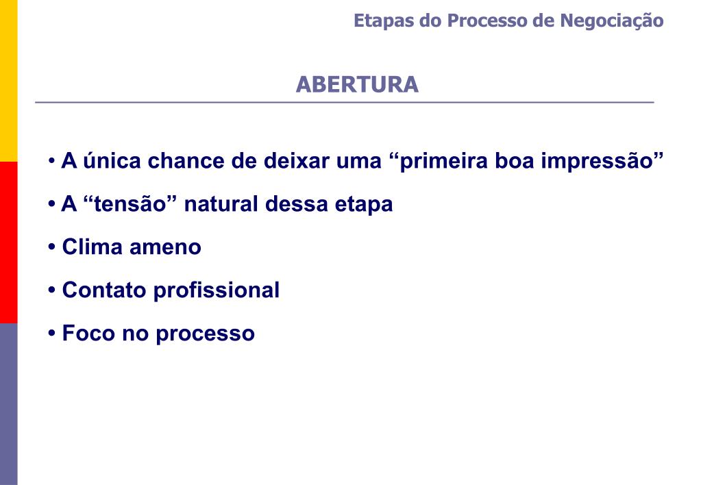 Etapas do Processo de Negociação ABERTURA • A única chance de deixar uma “primeira boa impressão” • • A “tensão” natural dessa etapa • • Clima ameno • • Contato profissional • • Foco no processo