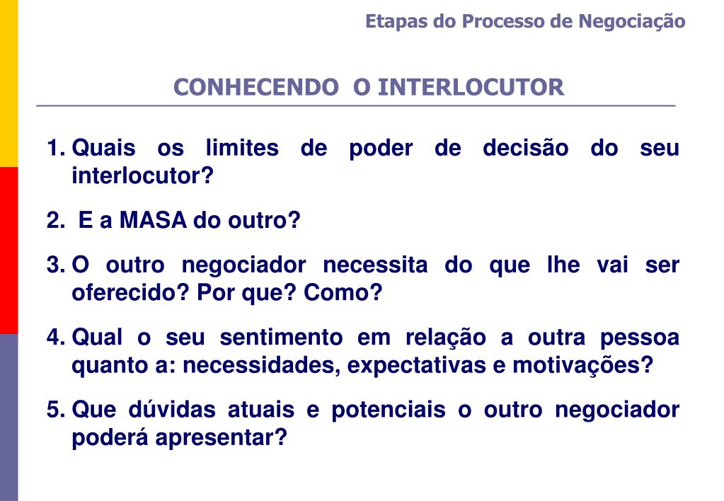 Etapas do Processo de Negociação CONHECENDO O INTERLOCUTOR • Quais os limites de poder de decisão do seu interlocutor? • E a MASA do outro? • O outro negociador necessita do que lhe vai ser oferecido? Por que? Como? • Qual o seu sentimento em relação a outra pessoa quanto a: necessidades, expectativas e motivações? • Que dúvidas atuais e potenciais o outro negociador poderá apresentar?