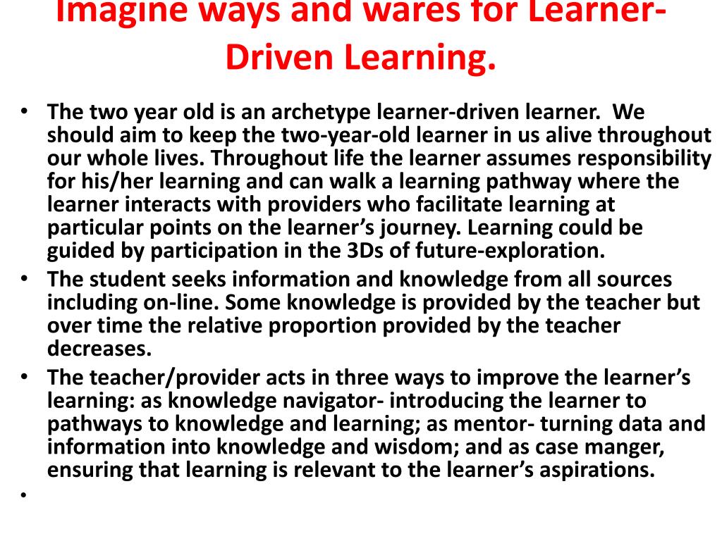 Imagine ways and wares for Learner-Driven Learning. • The two year old is an archetype learner-driven learner. We should aim to keep the two-year-old learner in us alive throughout our whole lives. Throughout life the learner assumes responsibility for his/her learning and can walk a learning pathway where the learner interacts with providers who facilitate learning at particular points on the learner’s journey. Learning could be guided by participation in the 3Ds of future-exploration. • The student seeks information and knowledge from all sources including on-line. Some knowledge is provided by the teacher but over time the relative proportion provided by the teacher decreases. • The teacher/provider acts in three ways to improve the learner’s learning: as knowledge navigator- introducing the learner to pathways to knowledge and learning; as mentor- turning data and information into knowledge and wisdom; and as case manger, ensuring that learning is relevant to the learner’s aspirations.