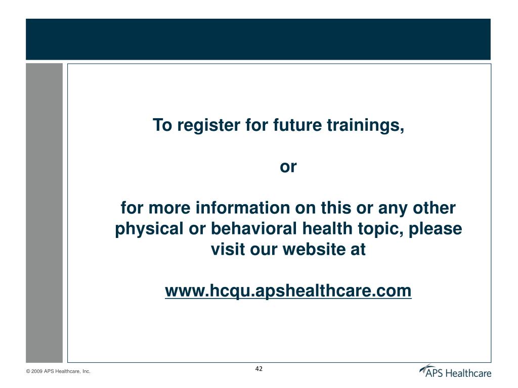 To register for future trainings,orfor more information on this or any other physical or behavioral health topic, please visit our website at www.hcqu.apshealthcare.com