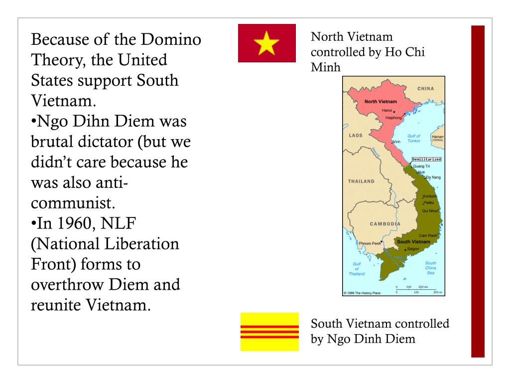 Because of the Domino Theory, the United States support South Vietnam. • Ngo Dihn Diem was brutal dictator (but we didn’t care because he was also anti-communist. • In 1960, NLF (National Liberation Front) forms to overthrow Diem and reunite Vietnam. North Vietnam controlled by Ho Chi Minh South Vietnam controlled by Ngo Dinh Diem