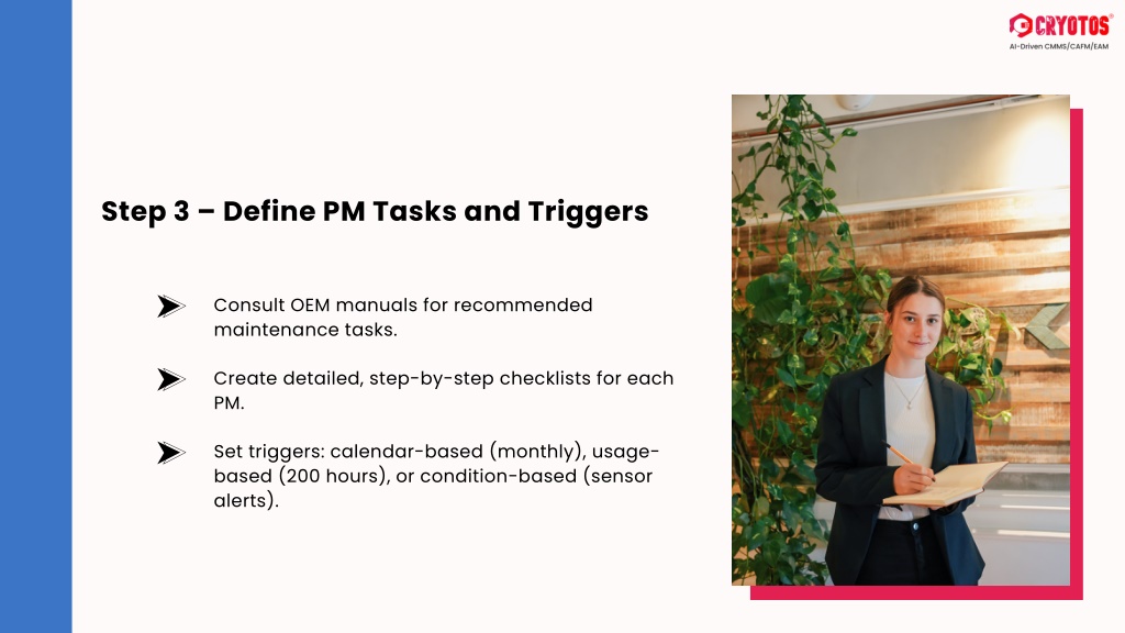 4. Step 3 – Define PM Tasks and Triggers Consult OEM manuals for recommended maintenance tasks. Create detailed, step-by-step checklists for each PM. Set triggers: calendar-based (monthly), usage- based (200 hours), or condition-based (sensor alerts).