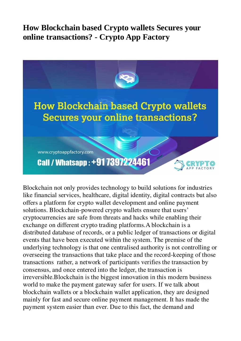 How Blockchain based Crypto wallets Secures your online transactions? - Crypto App Factory<br><br><br><br>Blockchain not only provides technology to build solutions for industries like financial services, healthcare, digital identity, digital contracts but also offers a platform for crypto wallet development and online payment solutions. Blockchain-powered crypto wallets ensure that usersu2019 cryptocurrencies are safe from threats and hacks while enabling their exchange on different crypto trading platforms.A blockchain is a distributed database of records, or a public ledger of transactions or digital
