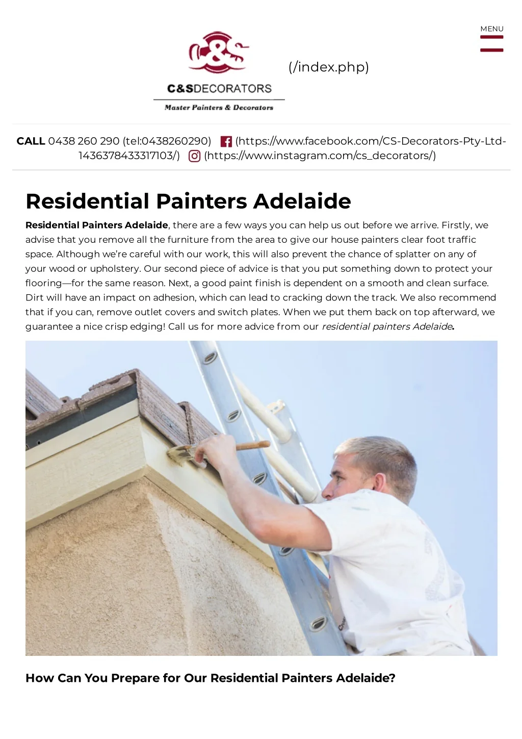 MENU (/index.php) CALL 0438 260 290 (tel:0438260290) 1436378433317103/) (https://www.facebook.com/CS-Decorators-Pty-Ltd- (https://www.instagram.com/cs_decorators/) Residential Painters Adelaide Residential Painters Adelaide, there are a few ways you can help us out before we arrive. Firstly, we advise that you remove all the furniture from the area to give our house painters clear foot traf?c space. Although we’re careful with our work, this will also prevent the chance of splatter on any of your wood or upholstery. Our second piece of advice is that you put something down to protect your ?ooring—for the same reason. Next, a good paint ?nish is dependent on a smooth and clean surface. Dirt will have an impact on adhesion, which can lead to cracking down the track. We also recommend that if you can, remove outlet covers and switch plates. When we put them back on top afterward, we guarantee a nice crisp edging! Call us for more advice from our residential painters Adelaide. How Can You Prepare for Our Residential Painters Adelaide?