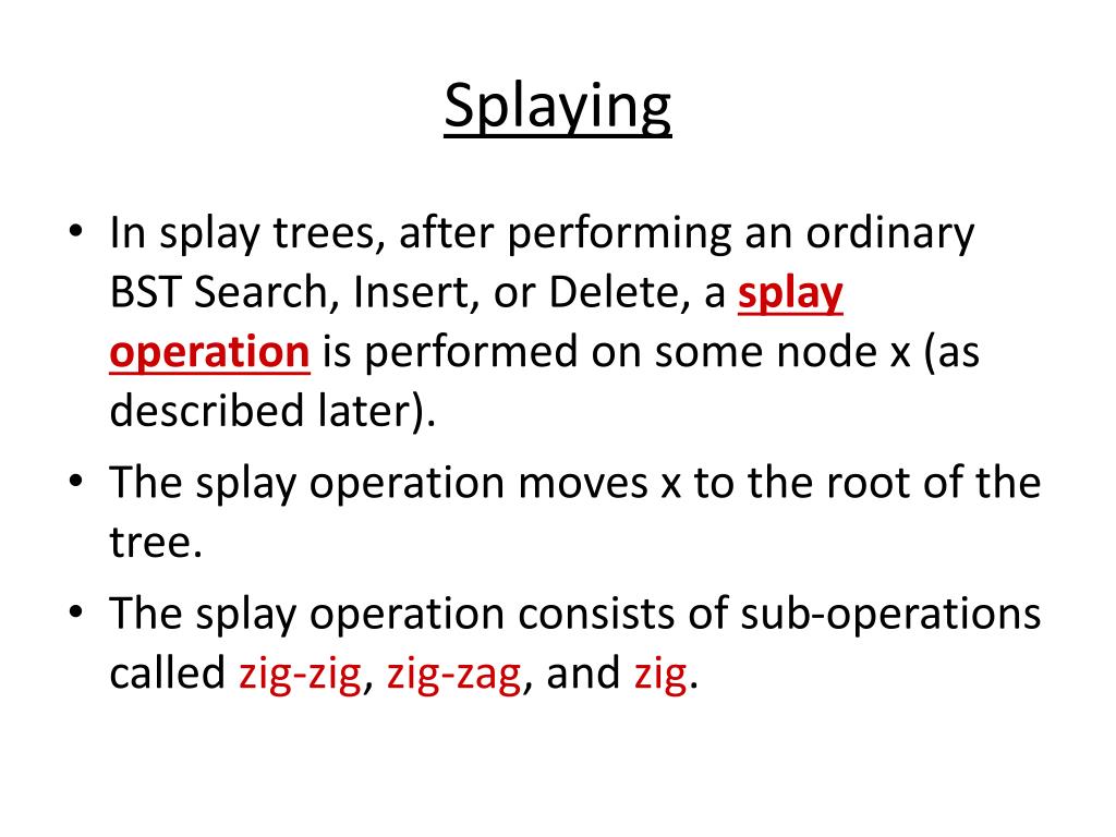 Splaying • In splay trees, after performing an ordinary BST Search, Insert, or Delete, a splay operation is performed on some node x (as described later). • The splay operation moves x to the root of the tree. • The splay operation consists of sub-operations called zig-zig, zig-zag, and zig.