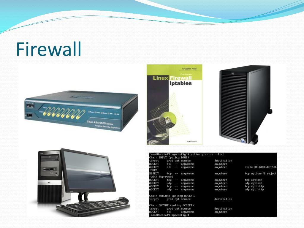 Firewall • Um firewall pode ser um PC, um roteador, um servidor, um appliance ou a combinação destes que determine qual informação ou serviços podem ser acessados de fora e a quem é permitido usar a informação e os serviços de fora.