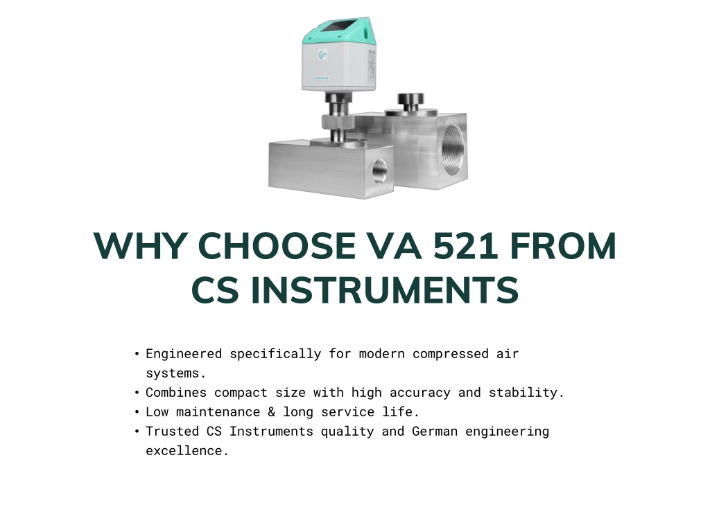 The VA 521 Compact Inline Flow Meter by CS Instruments is ideal for accurate measurement of compressed air and gases in limited installation spaces. The combination of its inline, size-efficient design, high accuracy, and no-moving-parts will provide stable, low-maintenance operation in any industrial application. <br><br>The VA 521 will work exceptionally well in any compressed air monitoring application, leakage detection, or energy management system. The inline, air flow meter is built for the 21st century to increase efficiency and sustainability for the long-term in a durable package.<br><br>