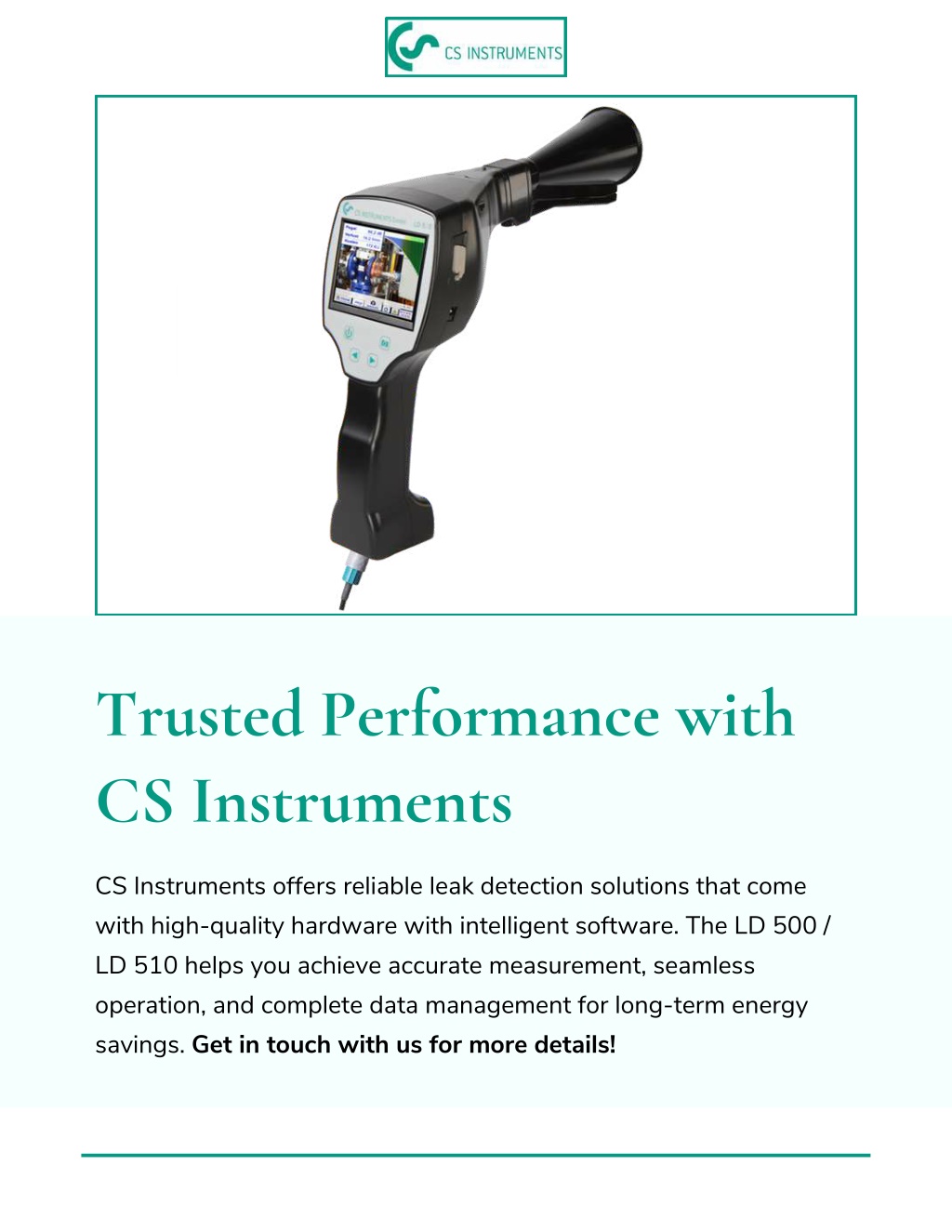 Trusted Performance with CS Instruments CS Instruments offers reliable leak detection solutions that come with high-quality hardware with intelligent software. The LD 500 / LD 510 helps you achieve accurate measurement, seamless operation, and complete data management for long-term energy savings. Get in touch with us for more details!