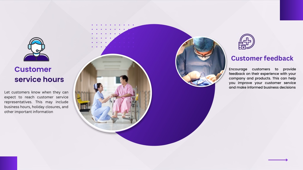 Customer feedback Customer service hours Encourage feedback on their experience with your company and products. This can help you improve your customer service and make informed business decisions customers to provide Let customers know when they can expect to reach customer service representatives. This may include business hours, holiday closures, and other important information