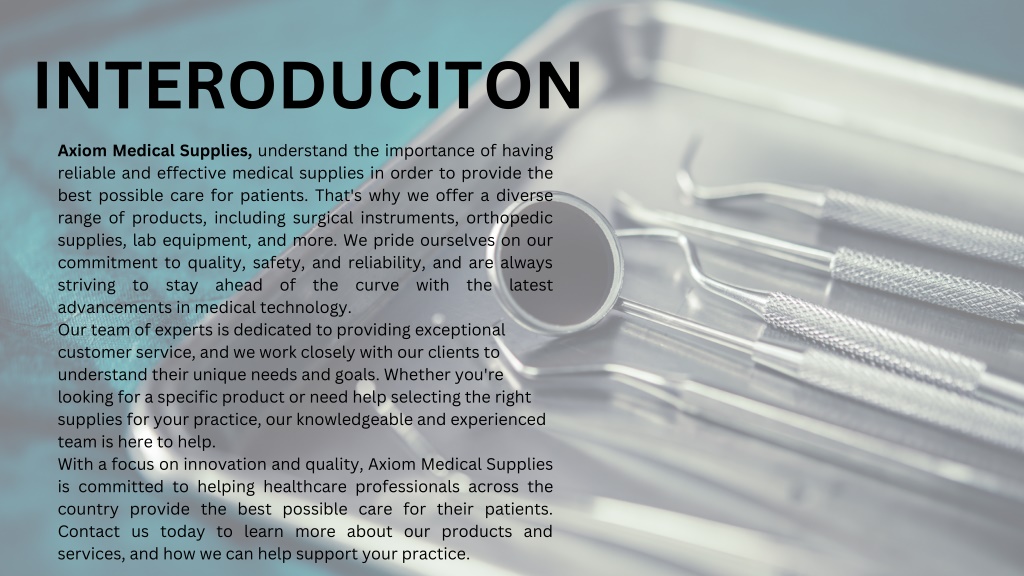 INTERODUCITON Axiom Medical Supplies, understand the importance of having reliable and effective medical supplies in order to provide the best possible care for patients. That's why we offer a diverse range of products, including surgical instruments, orthopedic supplies, lab equipment, and more. We pride ourselves on our commitment to quality, safety, and reliability, and are always striving to stay ahead of the curve with the latest advancements in medical technology. Our team of experts is dedicated to providing exceptional customer service, and we work closely with our clients to understand their unique needs and goals. Whether you're looking for a specific product or need help selecting the right supplies for your practice, our knowledgeable and experienced team is here to help. With a focus on innovation and quality, Axiom Medical Supplies is committed to helping healthcare professionals across the country provide the best possible care for their patients. Contact us today to learn more about our products and services, and how we can help support your practice.