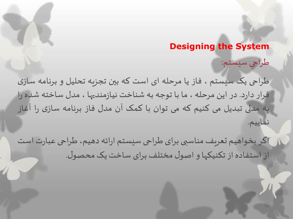 Designing the System طراحی سیستم: طراحی یک سیستم ، فاز یا مرحله ای است که بین تجزیه تحلیل و برنامه سازی قرار دارد. در این مرحله ، ما با توجه به شناخت نیازمندیها ، مدل ساخته شده را به مدلی تبدیل می کنیم که می توان با کمک آن مدل فاز برنامه سازی را آغاز نماییم. اگر بخواهیم تعریف مناسبی برای طراحی سیستم ارائه دهیم، طراحی عبارت است از استفاده از تکنیکها و اصول مختلف برای ساخت یک محصول.