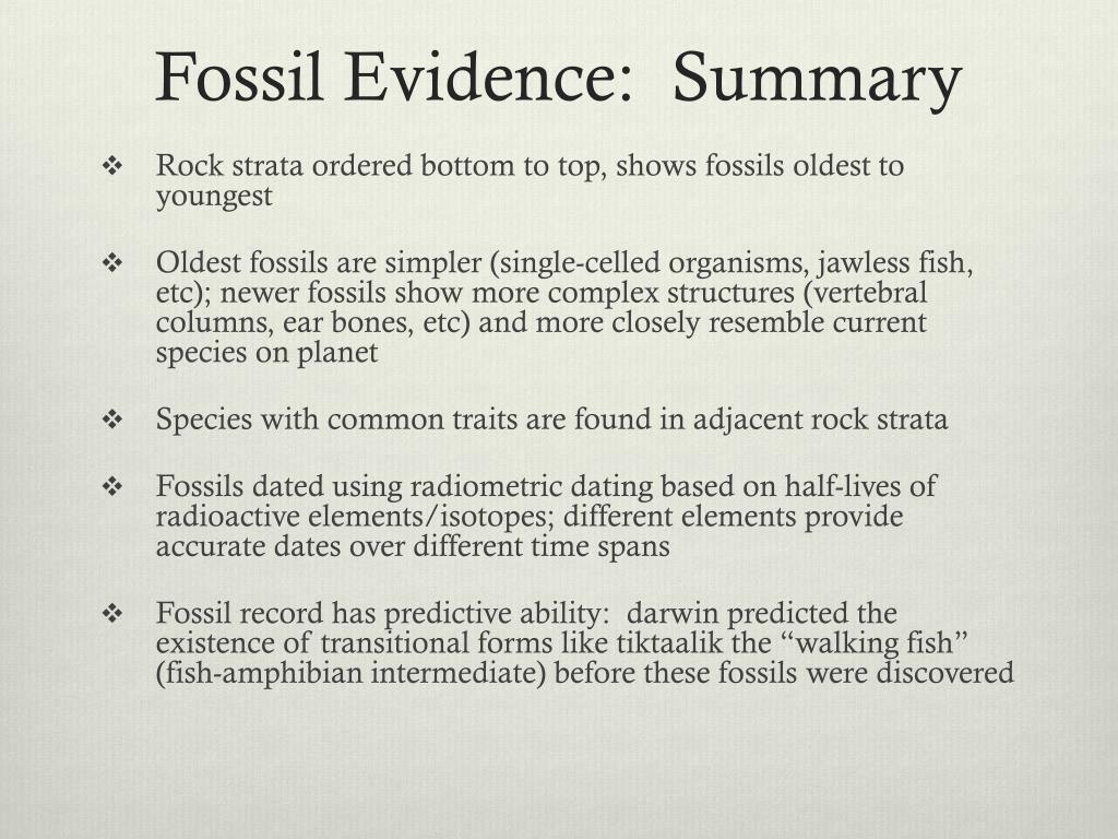 Fossil Evidence: Summary • Rock strata ordered bottom to top, shows fossils oldest to youngest • Oldest fossils are simpler (single-celled organisms, jawless fish, etc); newer fossils show more complex structures (vertebral columns, ear bones, etc) and more closely resemble current species on planet • Species with common traits are found in adjacent rock strata • Fossils dated using radiometric dating based on half-lives of radioactive elements/isotopes; different elements provide accurate dates over different time spans • Fossil record has predictive ability: darwin predicted the existence of transitional forms like tiktaalik the “walking fish” (fish-amphibian intermediate) before these fossils were discovered