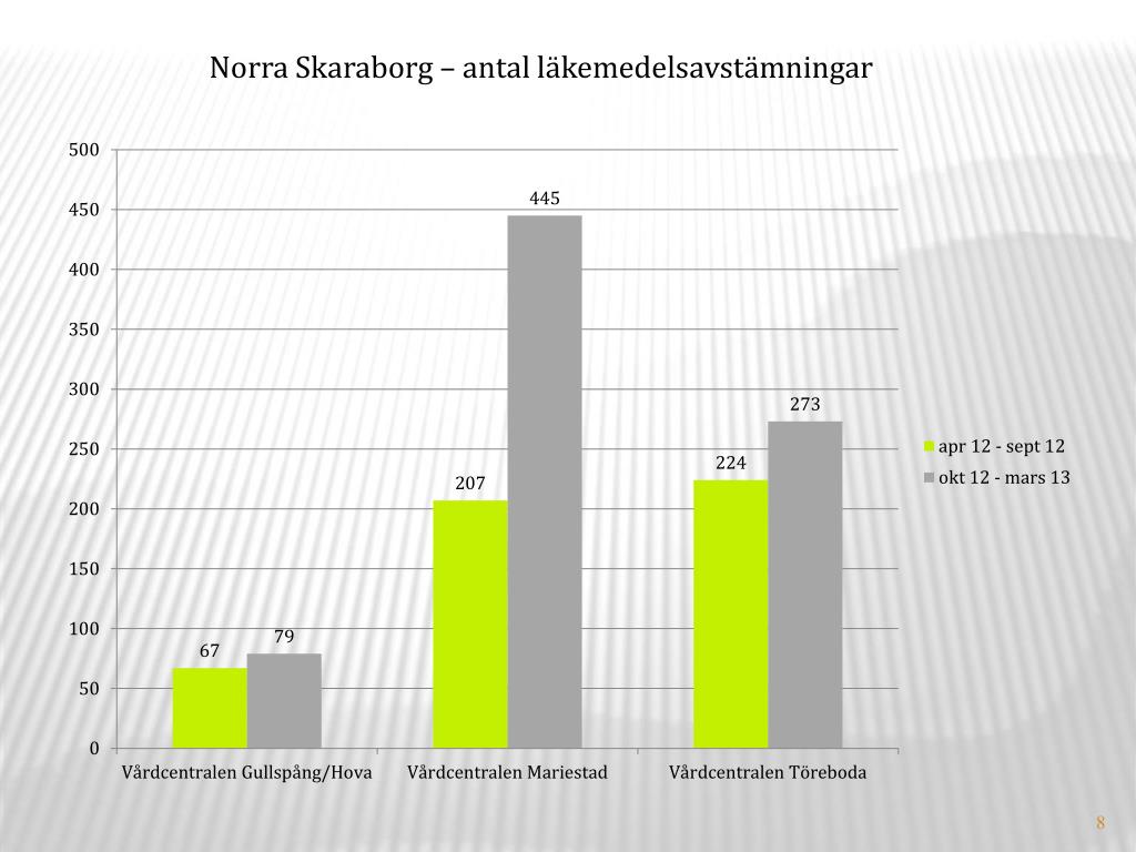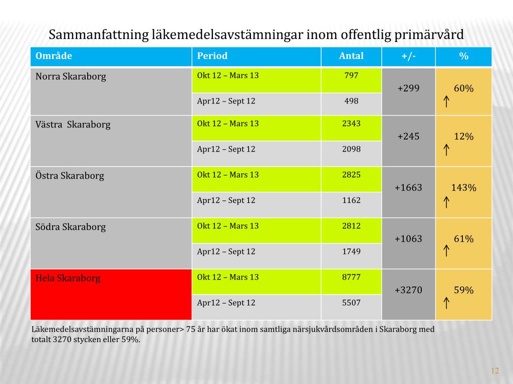 Sammanfattning läkemedelsavstämningar inom offentlig primärvård Läkemedelsavstämningarna på personer> 75 år har ökat inom samtliga närsjukvårdsområden i Skaraborgmed totalt 3270 stycken eller 59%.