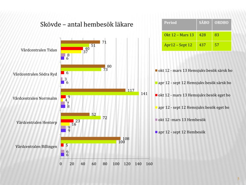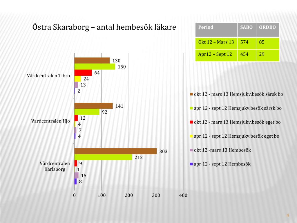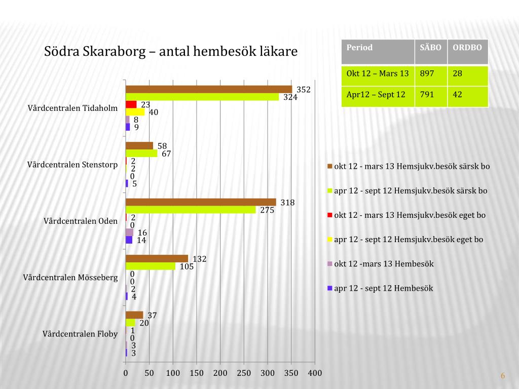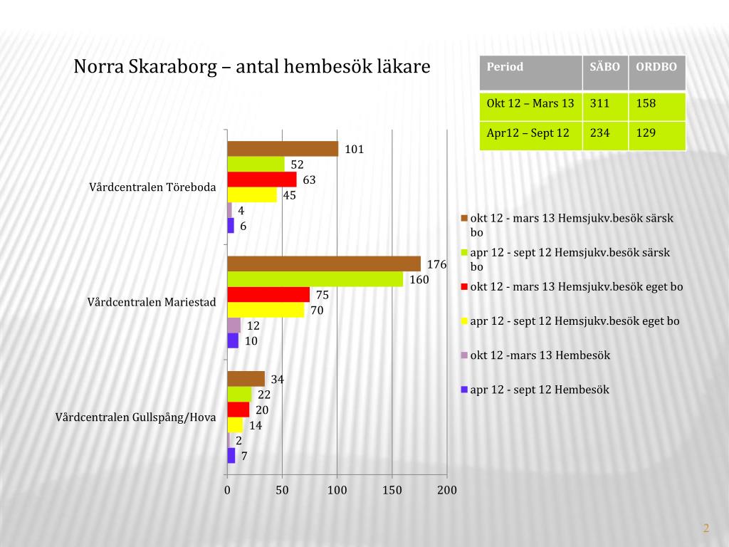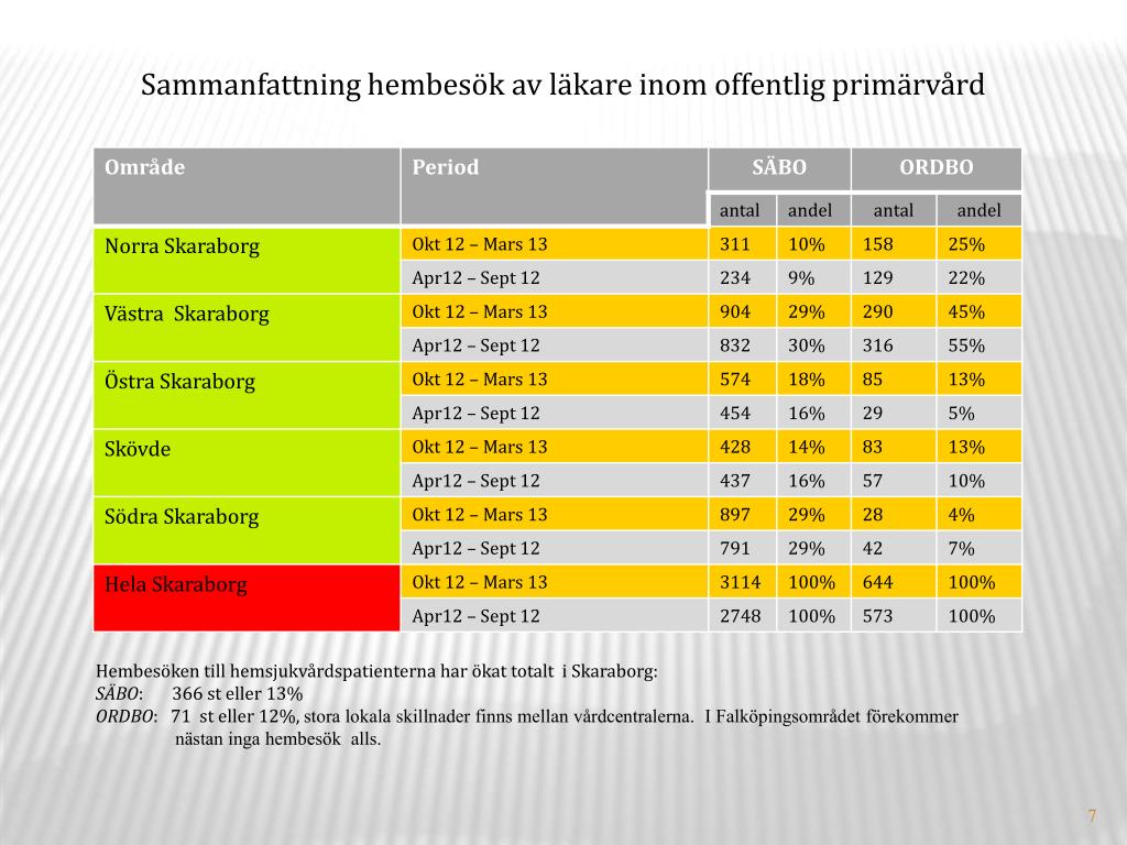 Sammanfattning hembesök av läkare inom offentlig primärvård Hembesöken till hemsjukvårdspatienterna har ökat totalt i Skaraborg: SÄBO: 366 st eller 13% ORDBO: 71 st eller 12%, stora lokala skillnader finns mellan vårdcentralerna. I Falköpingsområdet förekommer nästan inga hembesök alls.