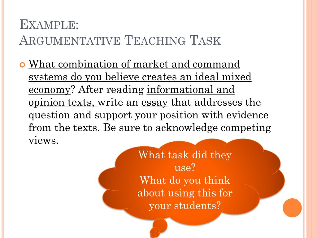 Example:Argumentative Teaching Task • What combination of market and command systems do you believe creates an ideal mixed economy? After reading informational and opinion texts, write an essay that addresses the question and support your position with evidence from the texts. Be sure to acknowledge competing views. What task did they use? What do you think about using this for your students?