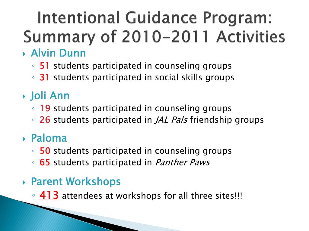 Intentional Guidance Program: Summary of 2010-2011 Activities • Alvin Dunn • 51 students participated in counseling groups • 31 students participated in social skills groups • Joli Ann • 19 students participated in counseling groups • 26 students participated in JAL Pals friendship groups • Paloma • 50 students participated in counseling groups • 65students participated in Panther Paws • Parent Workshops • 413attendees at workshops for all three sites!!!